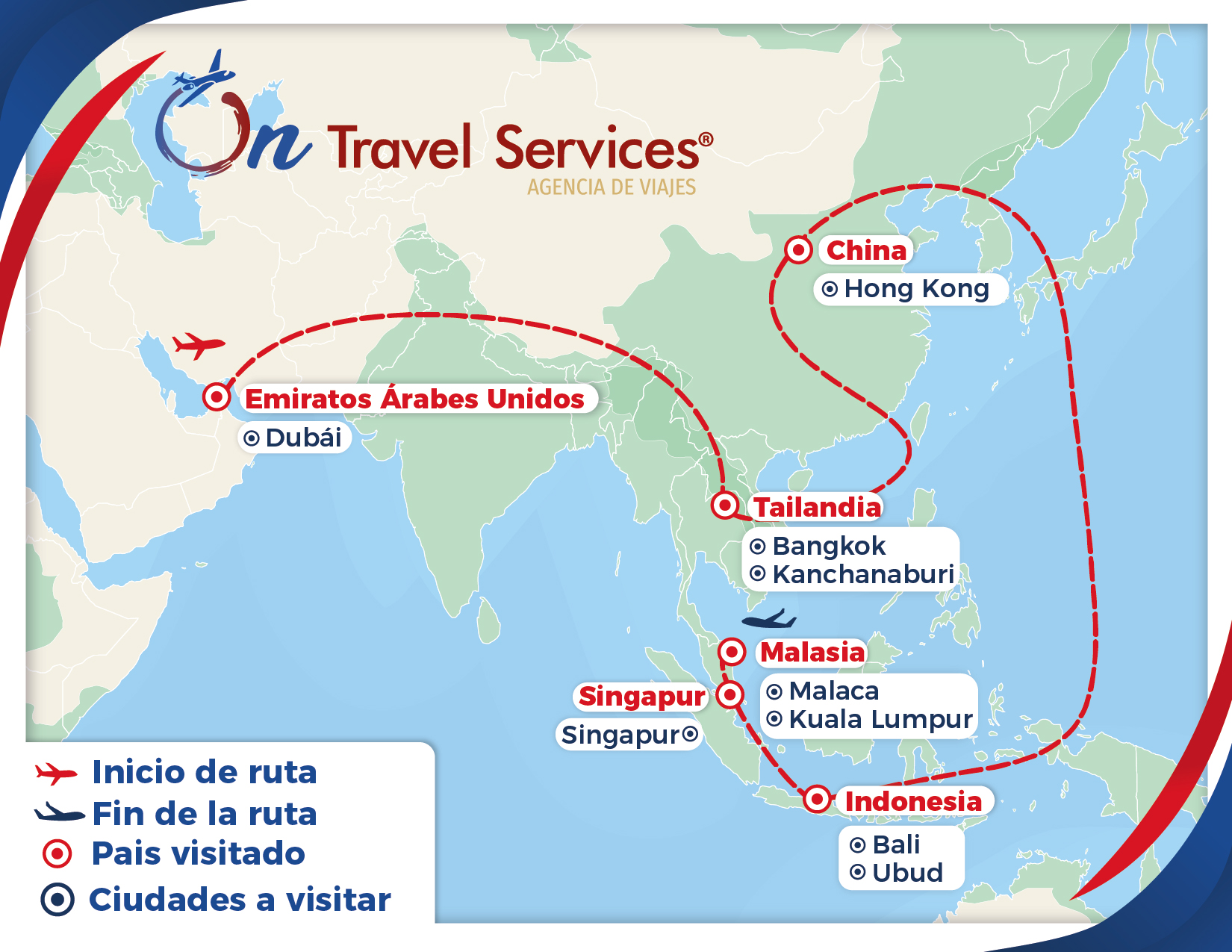 - Boleto de avión en viaje redondo México – Dubái – Bangkok – Hong Kong – Kuala Lumpur – México en clase turista (el vuelo puede tener conexiones).